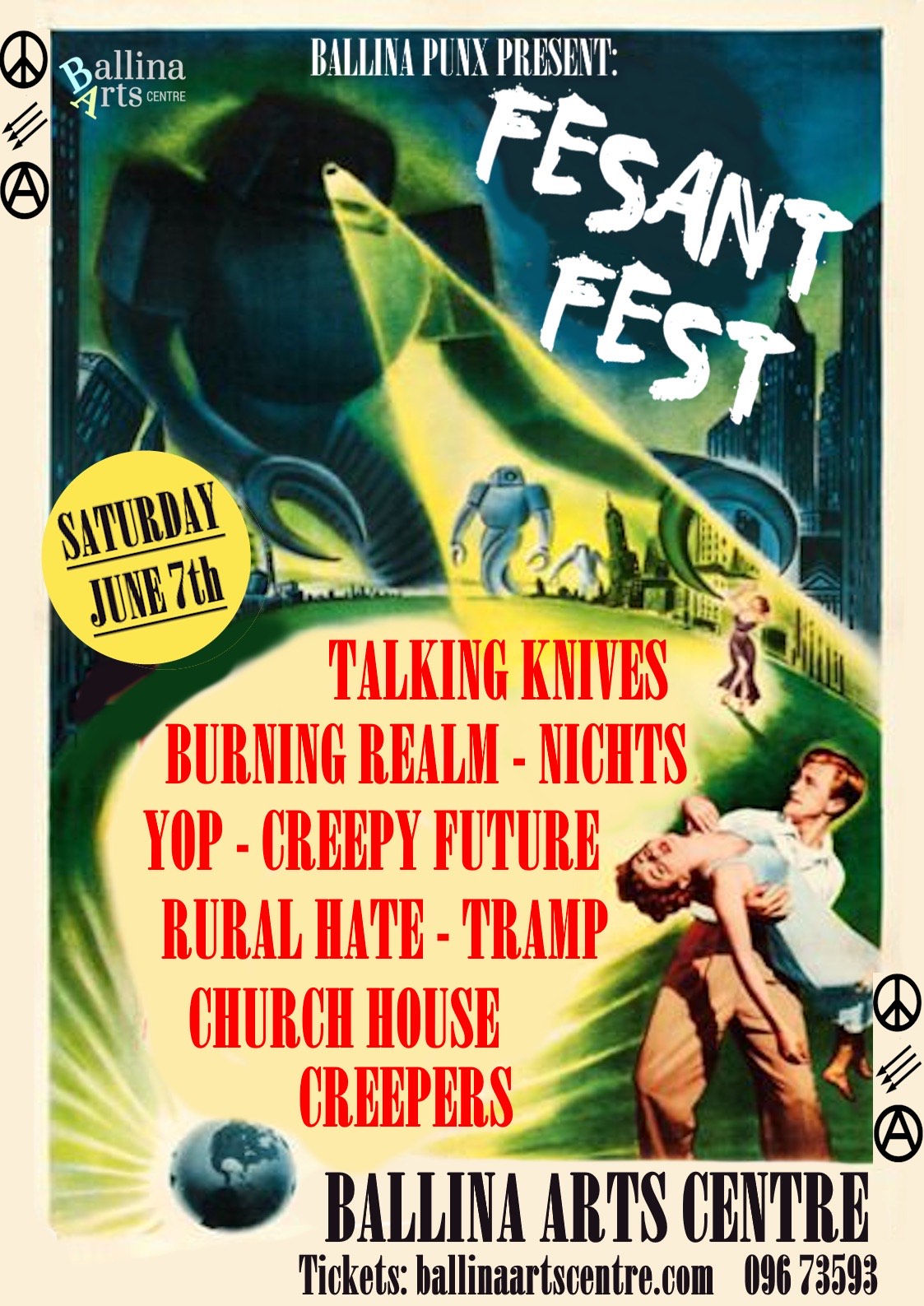 After “a bit of a hiatus” Ballina Punx resurrect Fesant Fest! Eight bands at the Arts Centre: Talking Knives, Yop, Tramp, Creepy Future, Rural Hate, Nichts, Burning Realm and Church House Creepers.